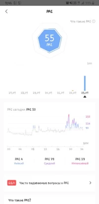 За свою цену браслет вполне себе неплох! К сожалению, нет многозадачности, нельзя выйти на рабочий циферблат во время работы таймера или чего-то подобного. Но это мелочи для такого устройства. Вообще, некоторые функции можно было бы реализовать и на экране MB2, но я понимаю, что производитель решил не заморачиваться. Пока тестирую метки поведения, надеюсь, они помогут браслету стать еще точнее. Вчера провел тренировки без смартфона: бег на беговой дорожке (3.5 км, браслет посчитал 4) и плавание. С подсчетом кругов/гребков все отлично, он точно отмерял 25-метровые отрезки по каждому касанию борта или остановке. Но стили плавания он пока не различает. А пульс в воде браслет не считает, возможно, это особенность таких устройств. Чувствительность сенсора очень хорошая, можно даже заканчивать тренировку мокрыми пальцами! Индекс активности PAI показал хороший прирост за вчерашний день, хоть я и не использовал силовые упражнения. В целом, браслет хороший помощник для поддержания активного образа жизни.